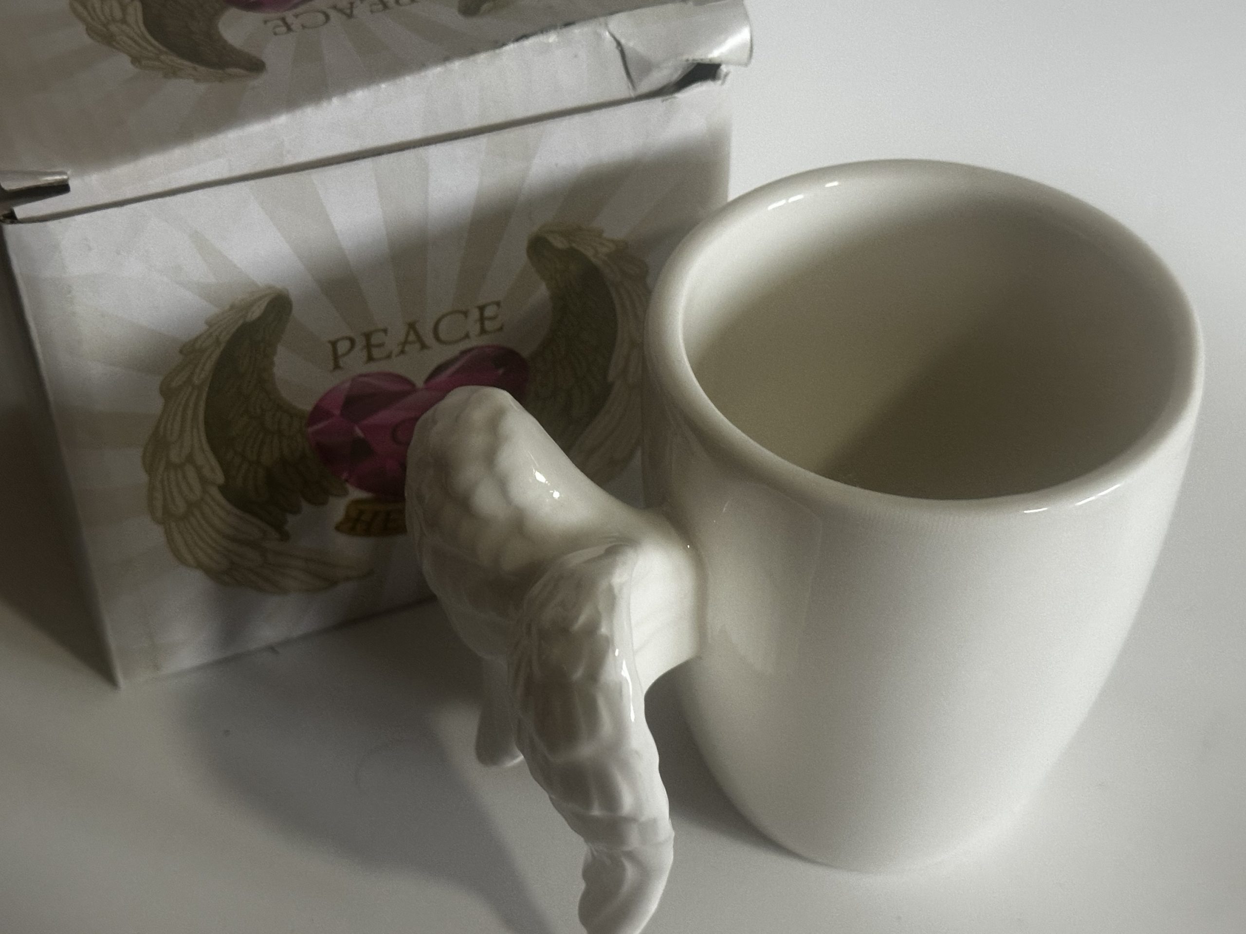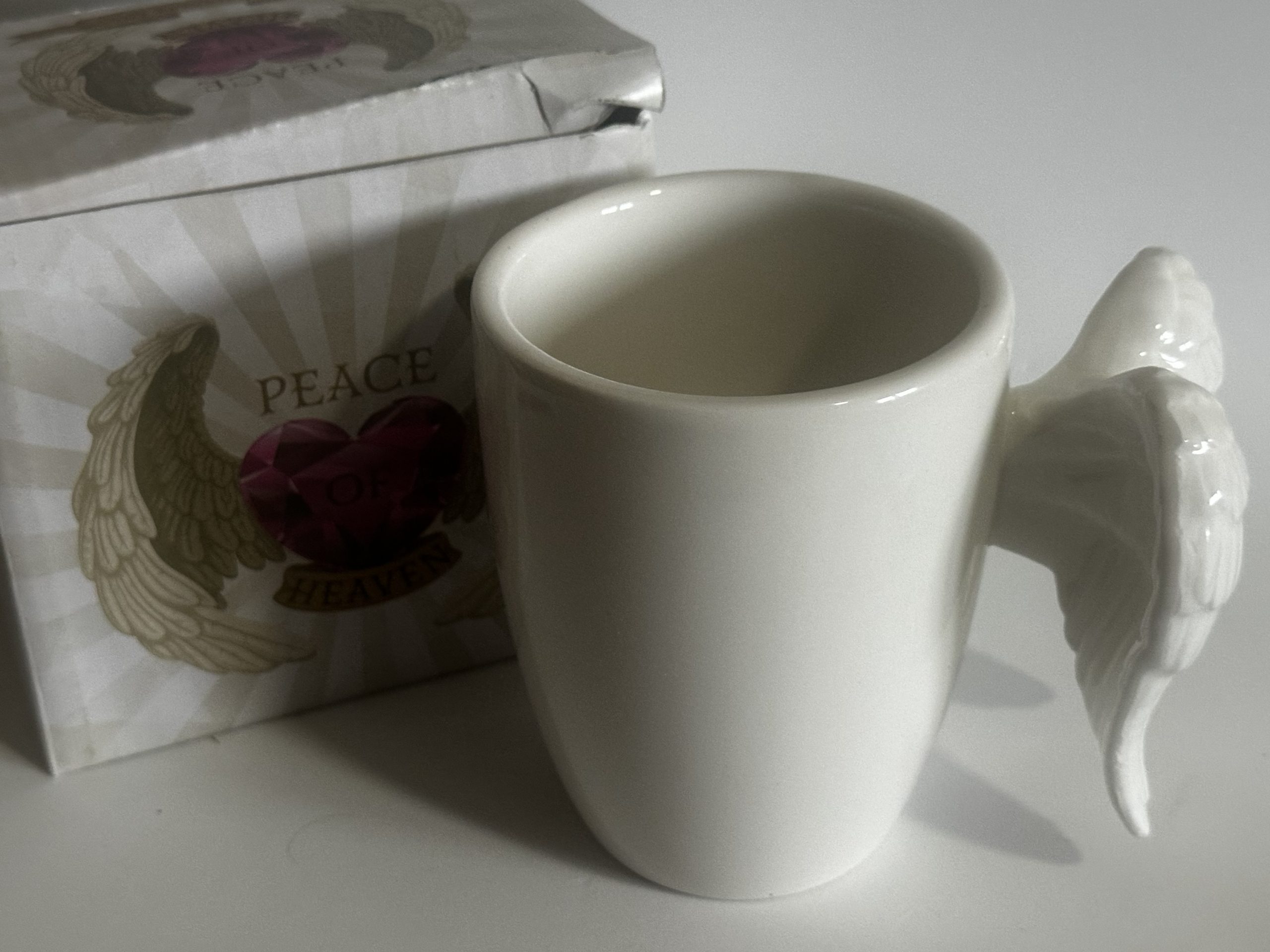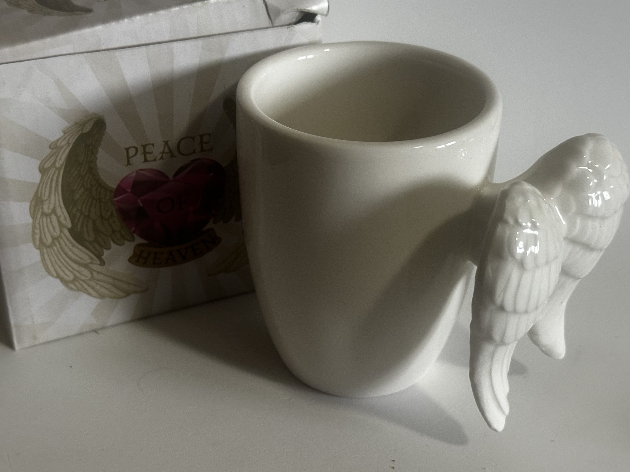 Esta hermosa taza de cerámica blanca cuenta con un asa en forma de alas de ángel, símbolo de protección, amor y armonía.